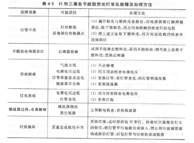 答:以H形三基色节能型荧光灯为例,其常见故障及处理方法见表4--5