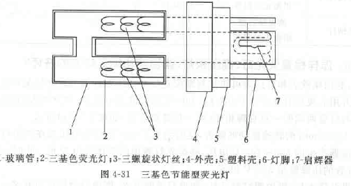 不基色节能型荧光灯的接线与普通荧光灯的接线完全相同,但其外部接线却很简单它既叮配用电感型镇流器(要配启辉器〕,也可配用电子镇流器〔不必配启辉器)。当与电感型镇流器配套使用时,只要将启辉器装在灯头塑料外壳内,并与灯丝链接即可(另外两根灯丝引线已山灯脚引出).如图4-31所示.