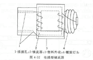 电感型镇流器单独装在一个塑料外壳内外壳的一端为擂接孔(接图4-31所示的荧光灯脚),另一端为螺旋灯头,所以其安装和使用非常方便、如图4--32所示