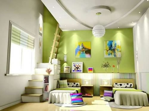 小户型室内空间十分紧张,要想为孩子设置专门的儿童房几乎不太可能。东易日盛装饰优秀设计师王鹏飞表示,在小户型中,儿童房的装饰大多与成人的房间类似,例如两居室中,很多家长没有把次卧室完全设计为五颜六色的儿童房,而是会选择色彩稍微鲜艳一些的成人家具,再配上一些公仔玩具,装饰出儿童房的感觉。