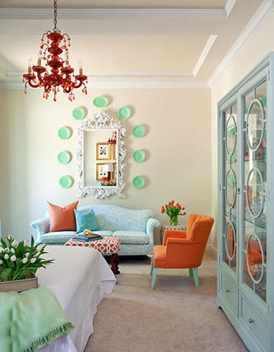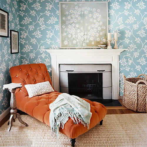 纯真而又温柔,安静却又积极向上,这就是小清新,这样的风格与橙色、蓝色的对撞不谋而合。蓝色的墙壁配上白色的花纹,进一步刻画出清新自然,而舒适的橙色贵妃椅,轻轻一笔营造出一个让人怦然心动的角落。(图)