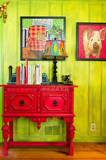 鲜嫩的绿色墙漆,一改旧木墙的古旧感,让墙壁新生,而艳丽的红色边桌与绿墙完成强烈对撞,小小的角落,释放出十分年轻自由的气氛,带着同色系的装饰画将墙壁进一步点缀,让角落不失活泼感。(图)
