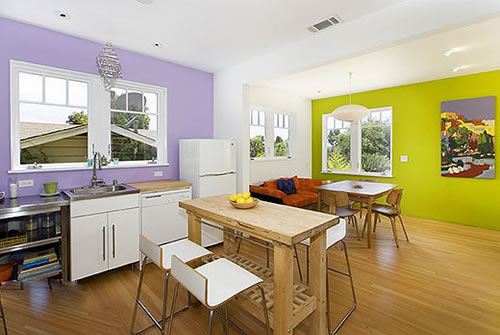 神秘又带有妖娆气质的紫色是一种较难搭配的颜色,让容易弄巧成拙,而它与对比色绿色的搭配更是在中国传统配色概念在红避之不及,其实随着人们对色彩的认识及表达的提高,绿与紫也能演绎出美丽。在这个餐厨为一体的居室中,虽然家具十分普通,但两面墙壁却让空间足够出彩,一面紫色一面绿色,遥望对撞,演绎清新餐厨空间。(图)