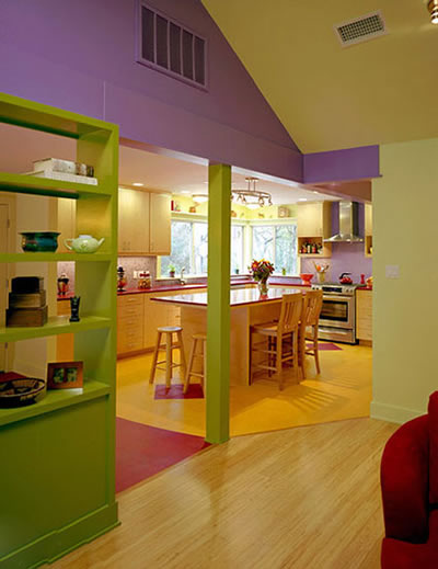 青翠的绿色与浪漫的紫色,有着另类的撞色效果,相互搭配能展现出魅力与清纯并存的个性家居,厨房的操作台墙面采用了紫色,外围隔断墙的三角部分也同样是紫色,绿色则于展示架与柱子上展现,让半开放式厨房缤纷多姿。