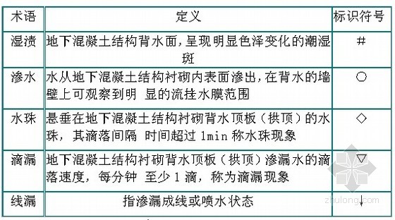 ⑹地下防水工程验收时,经检查、核对标示好的背水内表面的结构工程展开图必须纳入竣工验收资料。渗漏水现象描述使用的术语、定义和标识符号可按下表选用。渗漏水现象描述使用的术语、定义和标识符号