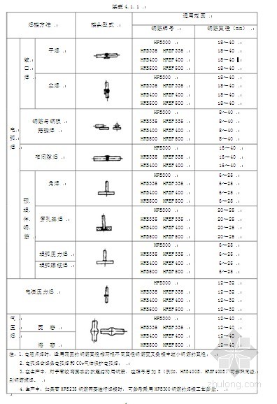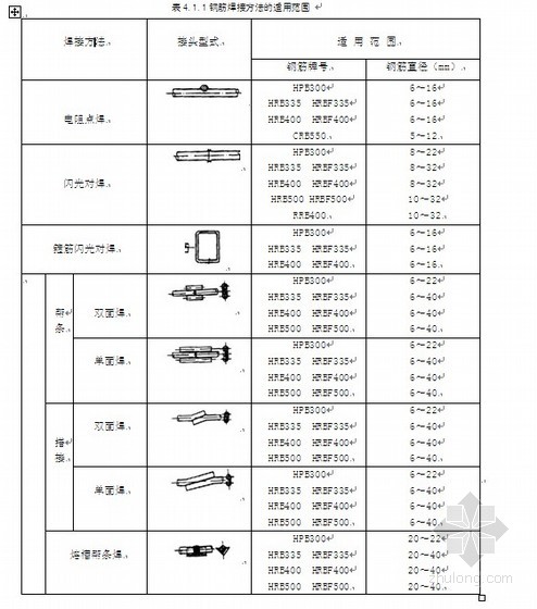 4.1.1钢筋焊接时,各种焊接方法的适用范围见表4.1.1的规定。