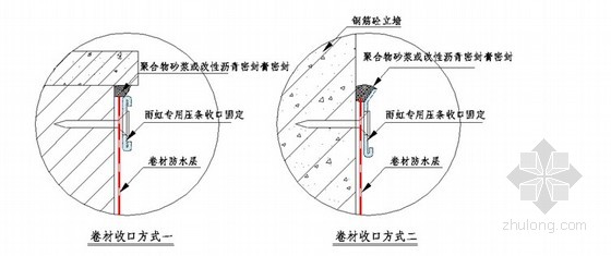卷材防水系统的终端收口处理是防水系统安全性能的集中表现,如果收口处理不好,会导致周边提前损坏。采用特制的收口金属压条,在保证防水系统的安全性能的前提下,对延长防水系统的安全使用寿命起到极大的帮助。如下图所示: