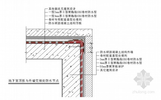 SBS卷材顶板与地下室外墙交接处施工方法节点图