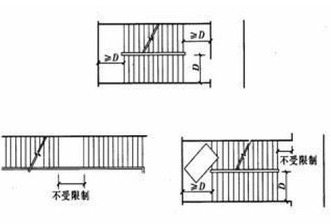 楼梯平台是连接楼地面与梯段端部的水平部分,有中间平台和楼层平台,平台深度不应小于楼梯梯段的宽度,并不应小于 1.2m,当有搬运大型物件需要时应适当加宽。但直跑楼梯的中间平台深度以及通向走廊的开敞式楼梯楼层平台深度,可不受此限制,如图所示。