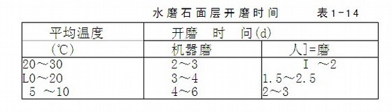 水磨石而层养护到开子不松动时即可开磨,开磨时间与温度有关,环境温度越高,开磨时间越短。扦磨时间可参考表1-14所列天数执行。