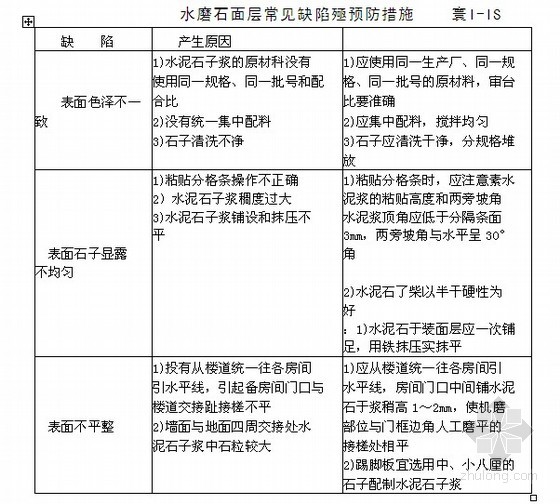 水磨石面层的缺陷、产生原因及预防措施见表1-15。