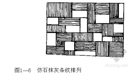 待面层砂浆收水后,用竹丝帚在各分格块的砂浆面上刷纹。刷纹要掌握好砂浆干湿程度。砂浆太干,扫出条纹不清晰{砂浆太湿,扫出条纹粗而不顺通。条纹刷成横向或直向,相邻两分格块的条纹应互相垂直,有矛盾时可留下一块不刷(图1-6)。