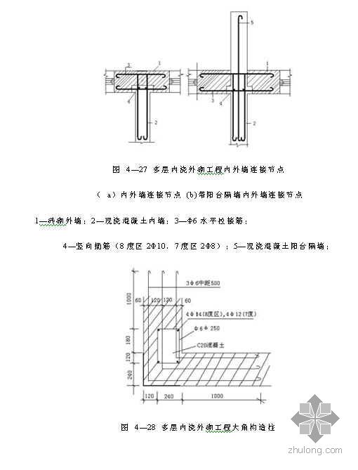 内浇外砌结构,根据建筑物层数和抗震设防烈度,在建筑区段四大角、内墙与外墙交接处,采取适当的连接构造(图427)(图428)。