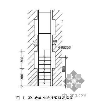 钢筋混凝土构造柱贯通建筑物全高,与屋盖、楼盖处的圈梁相连接,其主筋下端锚固在基础圈梁、基础大方角或桩基承台梁内;上端宜延伸至女儿墙顶部。构造柱周围的砌体应留槎(图429)。