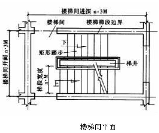 楼梯段宽度是指墙面至扶手中心线或扶手中心线之间的水平距离,如下图。楼梯段的宽度除应符合防火规范的规定外,供日常主要交通用的楼梯的梯段宽度应根据建筑物使用特征,按 每股人流宽为 0.55+(0~0.15) m 的人流股数确定,并 不应少于两股人流。0~0.15m 为人流在行进中人体的摆幅,公共建筑人流众多的场所应取上限值。