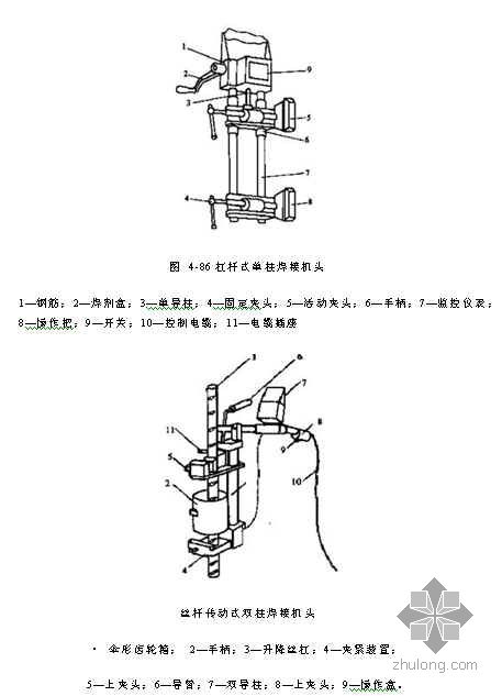 电渣压力焊可用手动电渣压力焊机或自动压力焊机。手动电渣压力焊由焊接变压器、夹具及控制箱等组成。图485。图486为杠杆式单柱焊接机头和丝杆传动式双柱焊接机头。