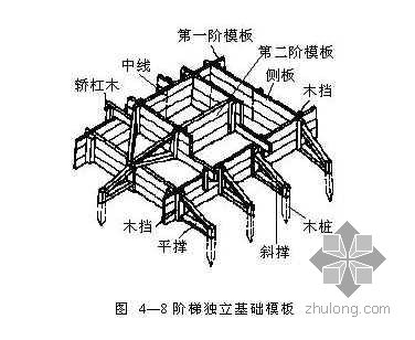 模板安装时,先在侧板内侧划出中线,在基坑底弹出基础中线。把各台阶侧板拼成方框。然后把下台阶模板放在基坑底,两者中线互相对准,并用水平尺校正其标高,在模板周围钉上木桩。上台阶模板放在下台阶模板上的安装方法相同。