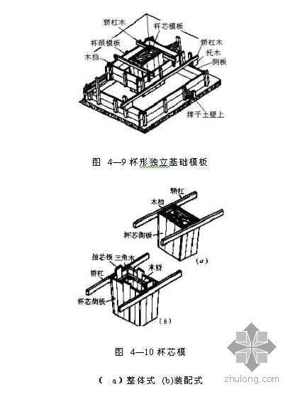 杯芯模有整体式和装配式两种(图410)。整体式杯芯模是用木板和木档根据杯口尺寸钉成一个整体,为了便于脱模,可在芯模的上口设吊环,或在底部的对角十字档穿设8号铅丝,以便于芯模脱模。装配式芯模是由四个角模组成,每侧设抽芯板,拆模时先抽去抽芯板,即可脱模(图410)。