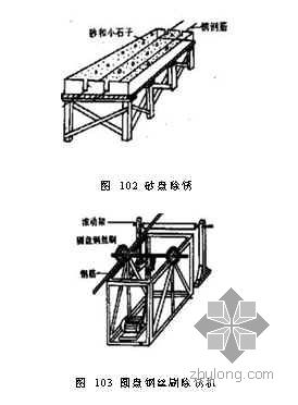 1)手工徐锈。工作量不大或在工地设置的临时工棚中操作时,可用麻袋布擦或用钢刷子刷;对于较粗的钢筋,可用砂盘除锈法,即制作钢槽或木槽,槽盘内放置干燥的粗砂和细石子,将有锈的钢筋穿进砂盘中来回抽拉。砂盘除锈的示意图(图102)。