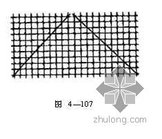 对于板和墙的钢筋网,除靠近外围两行钢筋的相交点应全部扎牢外,中间部分交叉点可间隔交替扎牢,但必须保证受力钢筋不产生位置偏移;在靠近外围两行钢筋的相交点最好按十字花扣绑扎;在按一面顺扣绑扎的区段内,绑扣的方向应根据具体情况交错地变化,以免网片朝一个方向歪扭,见图4107所示。对于面积较大的网片,可适当地用钢筋作斜向拉结加固。