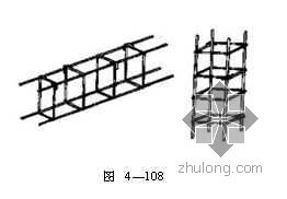 对梁和柱的箍筋,除设计有特殊要求(例如用于桁架端部节点采用斜向箍筋)之外,箍筋应与受力钢筋保持垂直;箍筋弯钩叠合处应沿受力钢筋方向错开放置,如图4108所示。其中梁的箍筋弯钩应放在受压区,即不放在受力钢筋这一面,在个别情况下,例如连续梁支座处,受压区在截面下部,要是箍筋弯钩位于下面,有可能被钢筋压开,这时,只好将箍筋弯钩放在受拉区(截面上部,即受力钢筋那一面),但应特别绑牢,必要时用电弧焊点焊几处。