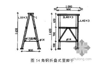 角钢折叠式里脚手架搭设间距砌墙时不超过2米,粉刷时不超过2.5m,可搭设两步架,第一步为1米,第二步为1.65米,每个重25Kg(图54)。