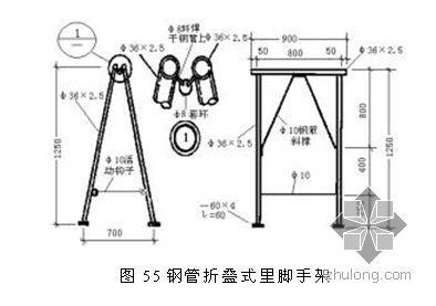 钢管折叠式里脚手架搭设间距砌墙时不超过1.8米,粉刷时不超过2.2m,每个重18Kg(图55)。