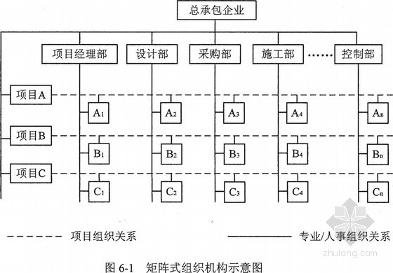 当总承包企业在一个经营期内同时承建多个工程项目时,总承包企业对每一个工程项目都需要建立一个项目管理机构,其管理人员的配置,根据项目的规模、特点和和管理的需要,从总承包企业各部门中选派,从而形成各项目管理组织与总承包企业职能业务部门的矩阵关系,如图6.1所示。