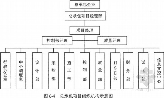 协助业主成立投产试运指挥机构,统一协调整个项目的投产试运工作。由于每个总承包项目都有各自特点,所以在其项目组织机构的设置方面也有差别,在本指导手册中给出了一种比较常见的总承包项目组织机构,以供使用者参考,如图6-4所示。