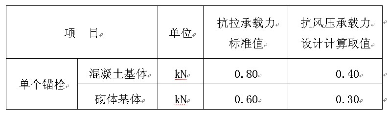 2 应根据抗风荷载计算确定锚栓的数量,单个锚栓抗风压承载力设计计算值应按表2.1取值。单个锚固件的抗拉承载力设计值取锚固件的抗拉承载力标准值乘以0.5。