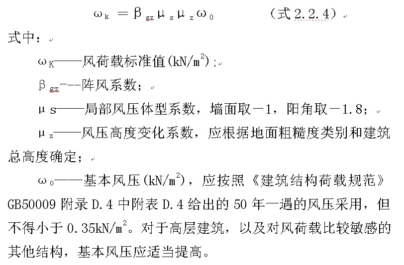 4 风荷载标准值的计算应按式2.2.4进行,相关系数取值执行现行国家标准《建筑结构荷载规范》GB 50009的规定: