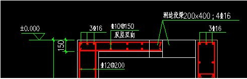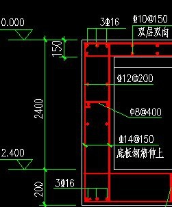 3此处用剪力墙画,C14@150为垂直钢筋,C12@200为水平钢筋 A8@400为拉筋 由于有压墙筋,而且上下都有3根,但是软件里面的剪力墙没有上下两端 所以都输入在统一一个位置上,所以输入6C16的压墙筋