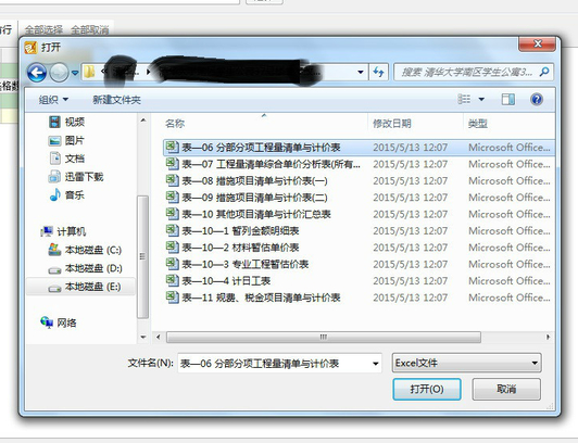 2、我们现在点最上面的选择,此时会出现选择EXCEL文件的对话框,我们选择招标方给定的分部分项工程量清单。
