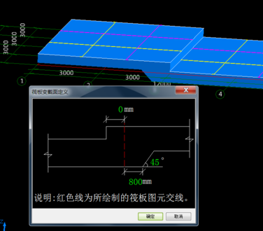 3布置完成以后我们选中刚才分别定义并布置的两块筏板,选则设置筏板变截面进入下图界面,然后根据相应提示按照图纸进行设置变截面位置的边坡等。