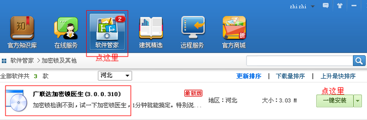 2、在G+里的软件管家里找到加密锁医生,安装并修复一下。