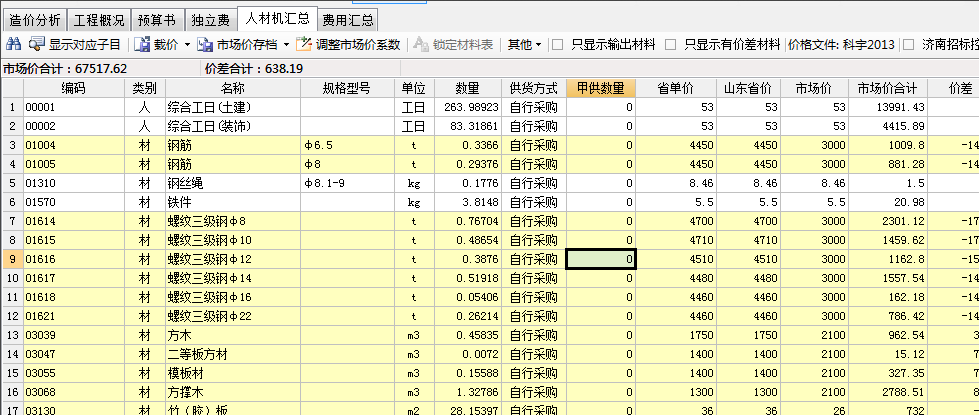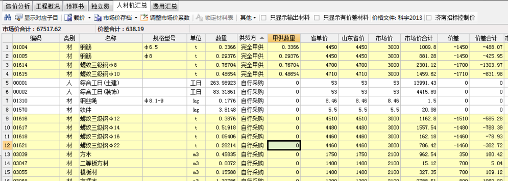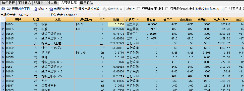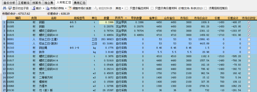 1将计价软件打开到人材机汇总表。如下图所示。