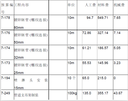 工程内容:管道安装,套管制作安装,水压试验,管网水冲洗,人工除轻锈、刷防锈漆两度、刷银粉漆两度预算编号工程内容单位人工费材料费机械费