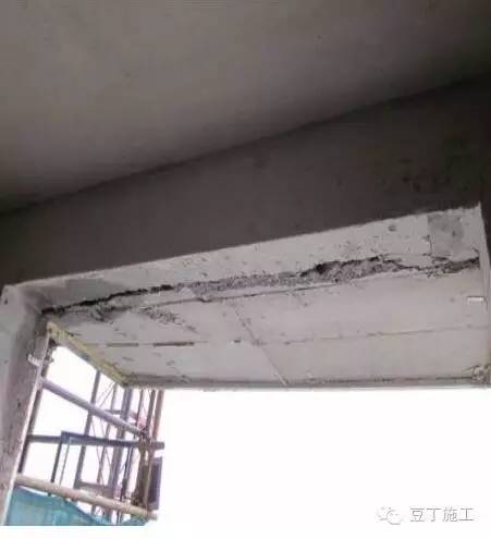 (3)施工单位对悬挑结构重视不够,弄错主筋直径或放反主筋,或受力下沉位移值大,削弱了悬挑结构的承载能力,或混凝土强度等级低于设计要求,过早拆模,致使悬挑构件沿嵌固端根部裂缝和断折。