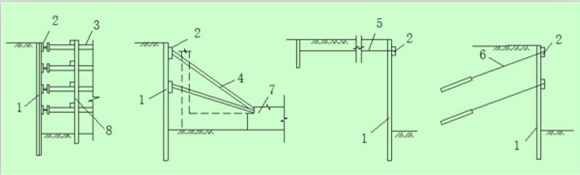 1板桩墙;2围檩;3钢支撑;4斜撑;5拉锚;6土锚杆;7先施工的基础;8竖撑