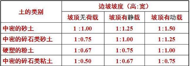 (3)最陡坡度规定:土质均、水位低、时间短、5m深以内。下表深度在5m内的基坑、基槽、管沟边坡的最陡坡度