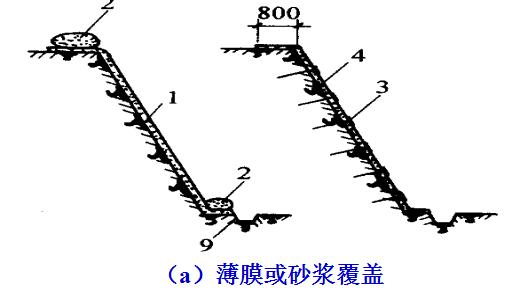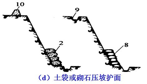(4)边坡护面措施:覆盖法,挂网法,挂网抹面法,土袋、砌砖压坡法,喷混凝土法、土钉墙