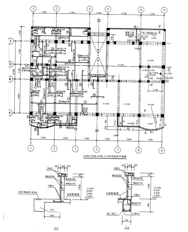 例如:JD5 18002100 +1.80 6208@150表示5号矩形洞口,洞宽1800 mm洞高2100mm,洞口中心距结构层1.8 m,洞上下设补强暗梁,暗梁的纵筋为620, 箍筋为8@150。