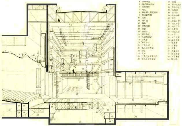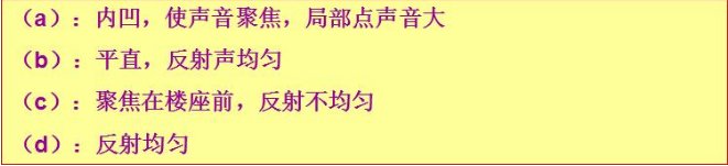 凡影剧院、电影院、会堂等建筑、大厅的音质要求对房间的剖面形状影响较大。为了保证室内声场分布均匀,防止出现空白区、回声和聚焦等现象,在剖面设计中要注意顶棚、墙面和地面的处理。为了保证观众后排不受前排的遮挡,加强直达声,必须使大厅地面逐渐升高,对于电影院、剧院、会堂等声学上的这种要求和视线上的要求是一致的。按照视线要求设计的地面一般能满足声学要求。除此之外顶棚的高度和形状是一个重要保证。