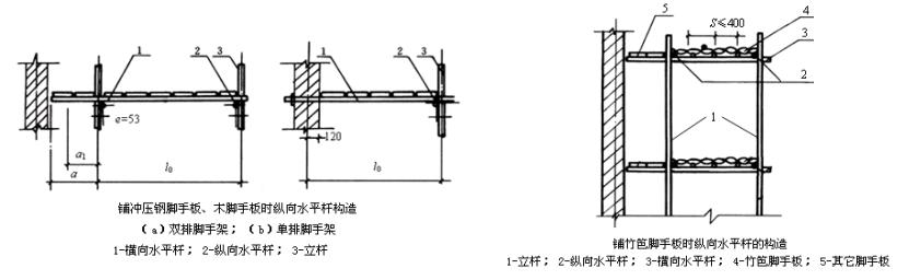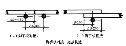 冲压钢脚手板、木脚手板等,应设置在三根横向水平杆上。当脚手板长度小于2m时,可采用两根横向水平杆支承,但应将脚手板两端与其可靠固定,可采用对接平铺,也可采用搭接铺设。