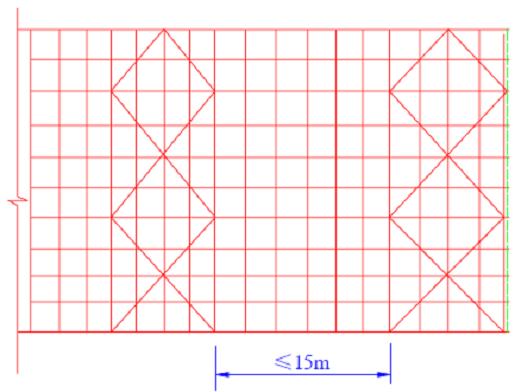 高度在24m以下的单双排脚手架,均必须在外侧立面的两端各设置一道剪刀撑,并应由底到顶连续设置;中间各道剪刀撑之间的净距不应大于15m;