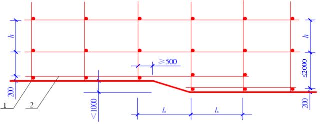 为保证脚手架的稳定,脚手架必须设置纵、横向扫地杆。纵向扫地杆应采用直角扣件固定在距底座上皮≯200mm处的立杆上。当基础不在同一高度上时,必须将高处的纵向扫地杆向低处延长两跨与立杆固定,高低差不宜大于1m。靠边坡上方的立杆轴线到边坡的距离不应小于500mm。