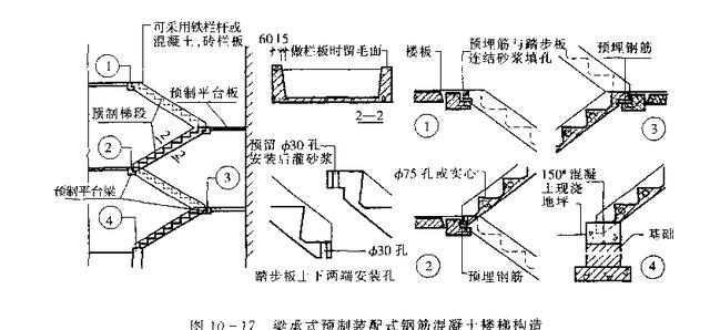 (1)粱承式预制装配式钢筋混凝土楼梯。梁承式预制装配式钢筋混凝土楼梯的预制梯段部分由预制平台粱来支撑。这类楼梯的梯段可分为梁承式梯段和板式梯段。粱承式梯段由斜梁和踏步板组成,踏步板支撑在两侧斜梁上.斜粱支撑在预制平台梁上。踏步板有L形断面和三角形断面。当L形断面踏步板时。其斜梁上面为锯齿形,用水泥砂浆固定踏步板;当使用三角形断面踏步板时.为了减轻自重.一般需要在板内做抽孔处理