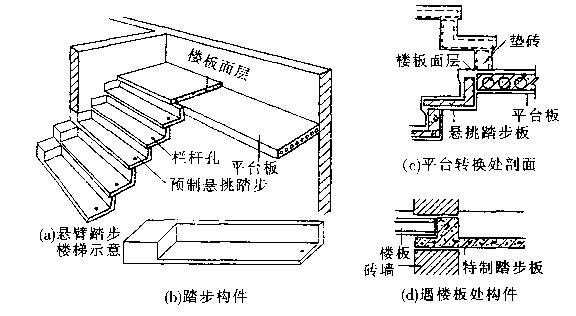 悬挑式墙承楼梯 是将预制踏步板一端压入墙体。利用踏步板以上墙体的压力和水泥砂浆的固结固定踏步板。踏步板有L形和平板形