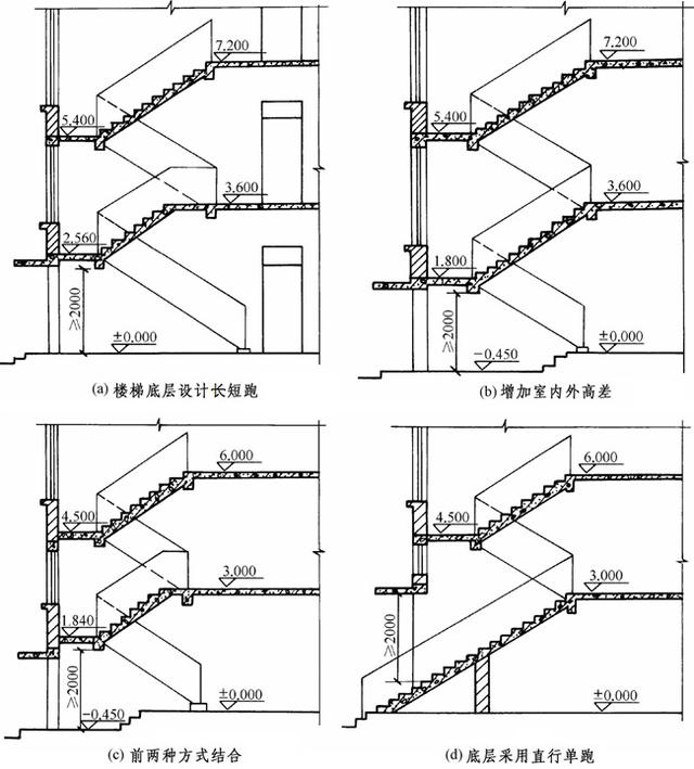 当楼梯底层中间平台下设置通道时,为满足平台下方空间净高2000mm,常采取右侧几种处理方法: