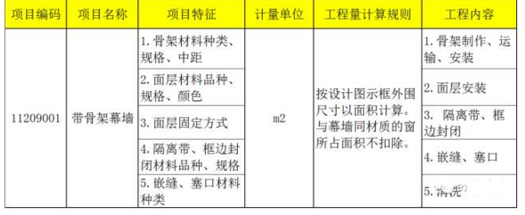 根据《建筑幕墙》(GB/T21086-2007),建筑幕墙按面板分为玻璃幕墙、金属板幕墙、人造板材幕墙等。带骨架幕墙是《玻璃幕墙工程技术规范》(JGJ102-2003)的分类方法,该规范只适用于玻璃幕墙,并未包括金属板幕墙。带骨架幕墙幕墙即框支承玻璃幕墙。《房屋建筑与装饰工程工程量清单计算规范》(GB 50854-2013)对框支承玻璃幕墙、金属幕墙并未加以区分,均套用带骨架幕墙的工程量清单。带骨架幕墙的清单设置,详见下表: